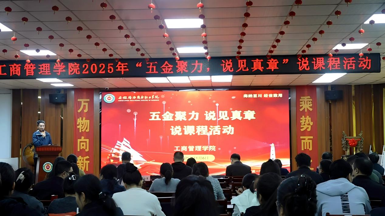 为深入贯彻落实学校教师队伍建设要求,助力学校“五金”建设发展战略,全面提升教师教学能力和专业素养,推动教学理念与方法创新,11月6日下午,工商管理学院在图书馆二楼成功举办2025年“五金聚力・说见真章”说课程比赛活动。校长助理、信息工程学院院长郭玉堂,校长助理、信息工程学院副院长吴艺妮,数字商贸与直播学院院长姚如富,教务处常务副处长汪芳、科研处处长陈辉、信息中心主任许乐灵,经贸旅游学院院长汪芳琳等专家教授亲临现场指导。工商管理学院副院长陆新文、副院长孙健康及全体教师共同观摩学习。