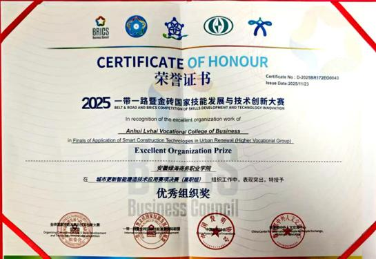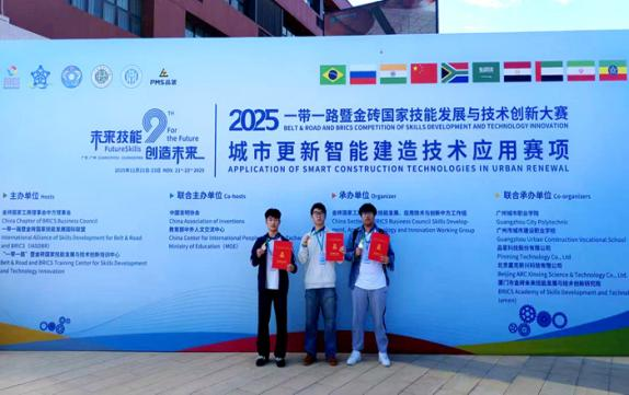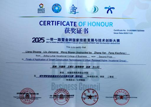 近日,2025一带一路暨金砖国家技能发展与技术创新大赛城市更新智能建造技术应用赛项决赛在广州圆满落幕。安徽绿海商务职业学院工商管理学院建筑消防技术专业梁爽、刘建杨、王博文三位同学组成的参赛团队,凭借扎实的专业功底与出色的实践能力,从全国124支参赛队伍中脱颖而出,荣获国赛二等奖;团队指导教师张燕、方小风获“优秀指导教师”称号;学校获“优秀组织奖”。这是继该校学子在交通土建数字化施工技术应用赛项获得国赛三等奖后,在该系列赛事中取得的又一突破。