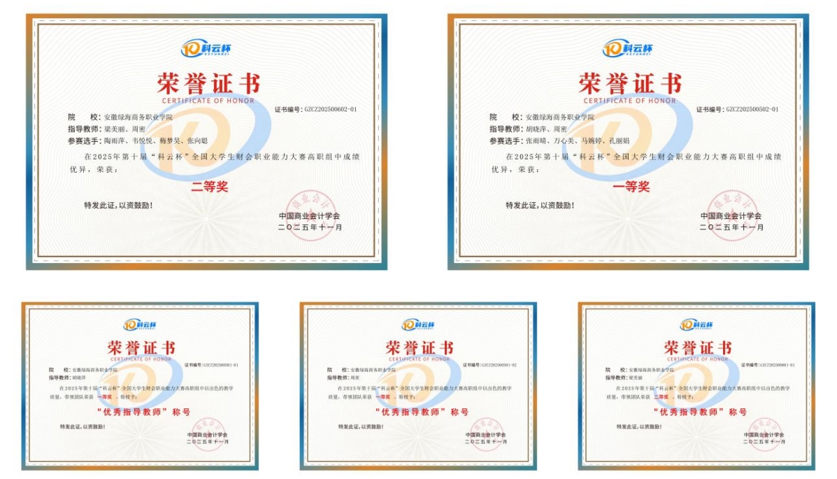 近日,工商管理学院财会学子在多项高级别学科竞赛中屡创佳绩,展现出扎实的育人实效与学科发展动能。在国家级赛项2025年第十届“科云杯”全国大学生财会职业能力大赛高职组中,荣获一等奖、二等奖各1项;在2025年安徽省大学生财税技能大赛案例赛(高职组)中,亦取得一等奖1项、二等奖3项、三等奖5项。3位指导老师荣获“优秀指导老师”称号。