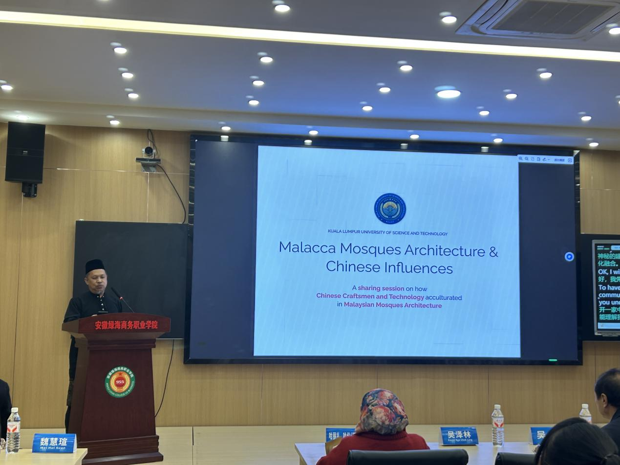 2026年1月16日下午,在“安徽绿海商务职业学院2026年中马文化交流周”活动中,工商管理学院邀请吉隆坡科技大学专家来我院开展讲座。马来西亚吉隆坡科技大学执行校长吴泽林教授、注册官哈丽扎·哈伦(丽丝)女士、建筑与环境建设学院院长利扎·胡申、研究生院教育学系主任魏慧瑄教授、项目总监卢国豪教授一行五人应邀出席。安徽绿海商务职业学院副校长吴玉,教务处处长孙佐、工商管理学院副院长陆新文、党支部书记黄清松、副院长孙健康及学院师生代表共同参加本次活动。